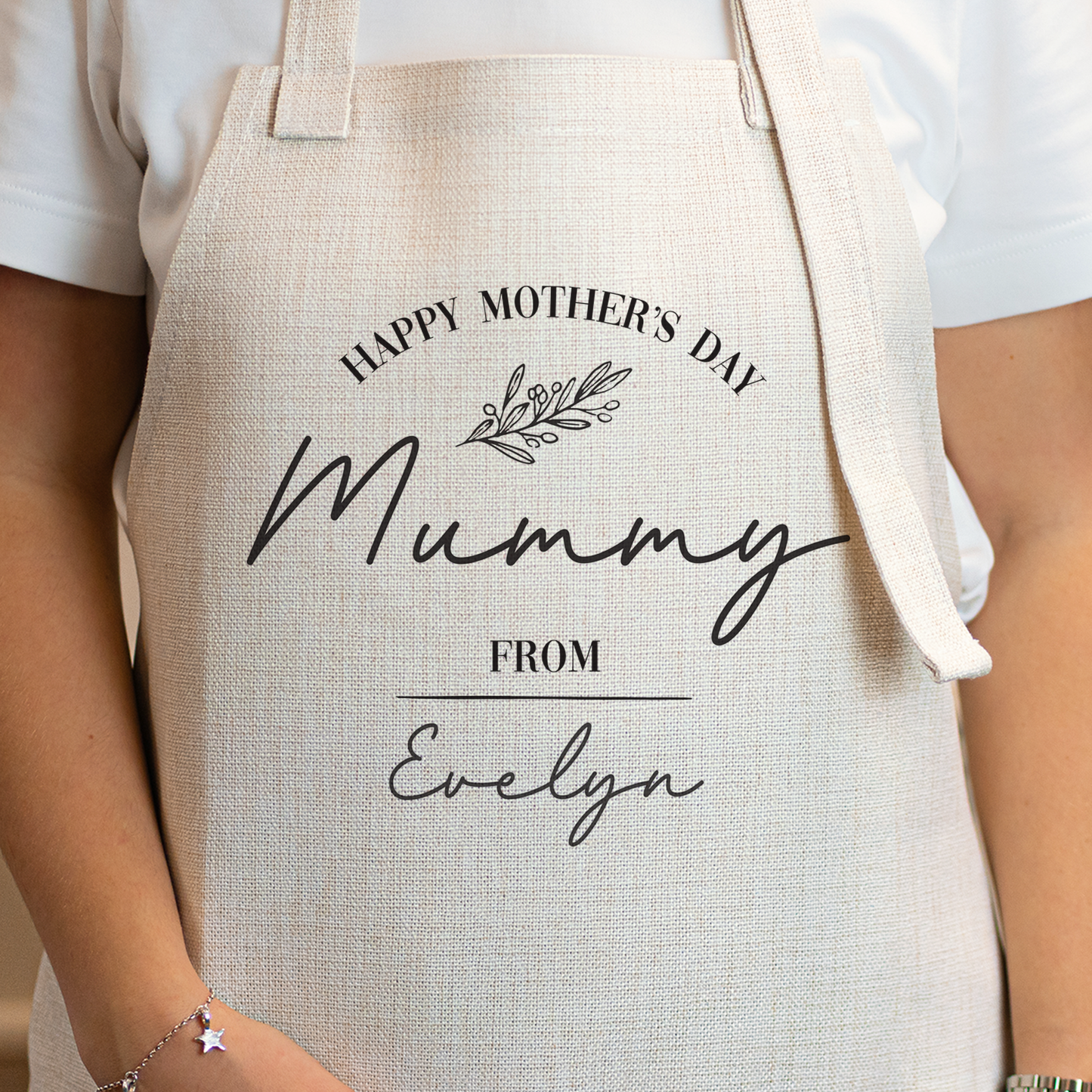 This stunning premium linen apron is the perfect gift this Mother's Day. It can be personalised with any name, so you can gift it to your Mum or to a grandparent. It features a stunning minimal leaf design, and can be personalised for a first mothers day or standard mothers day gift