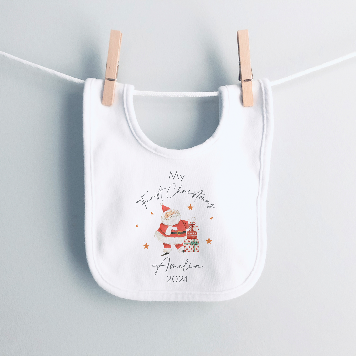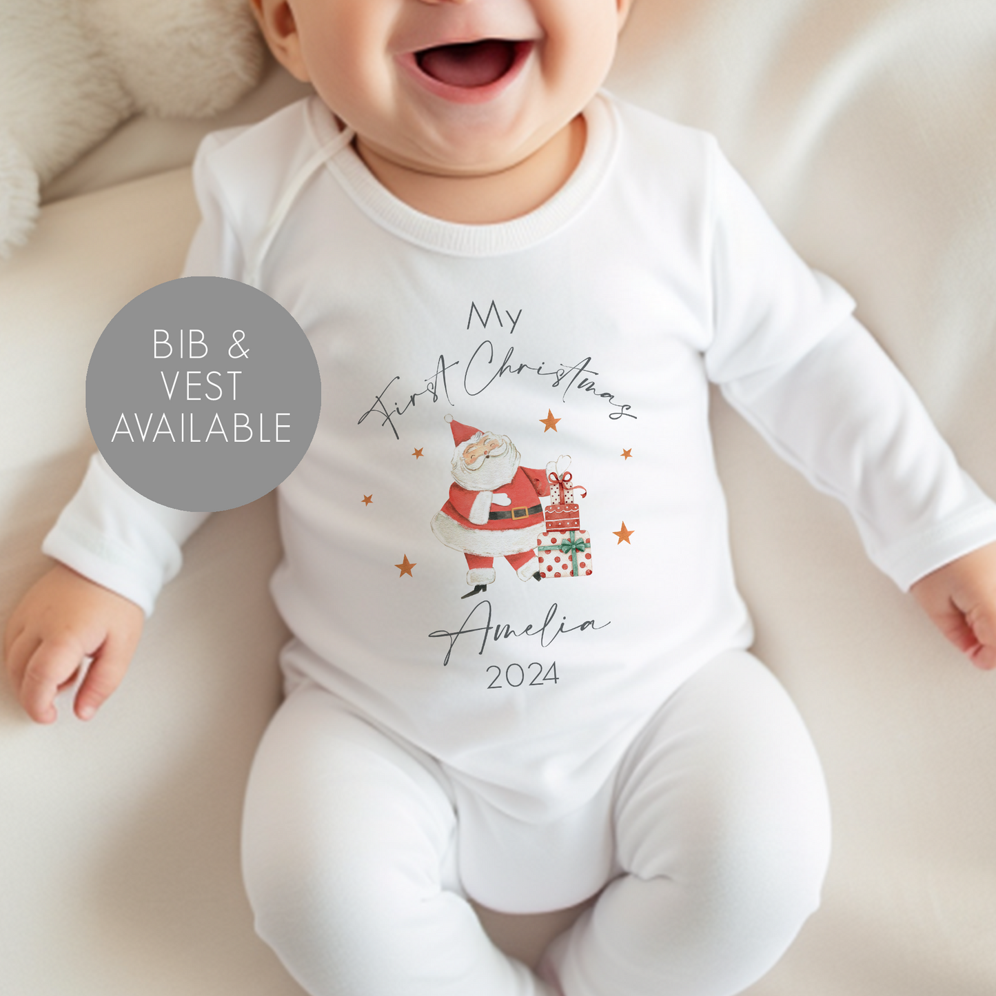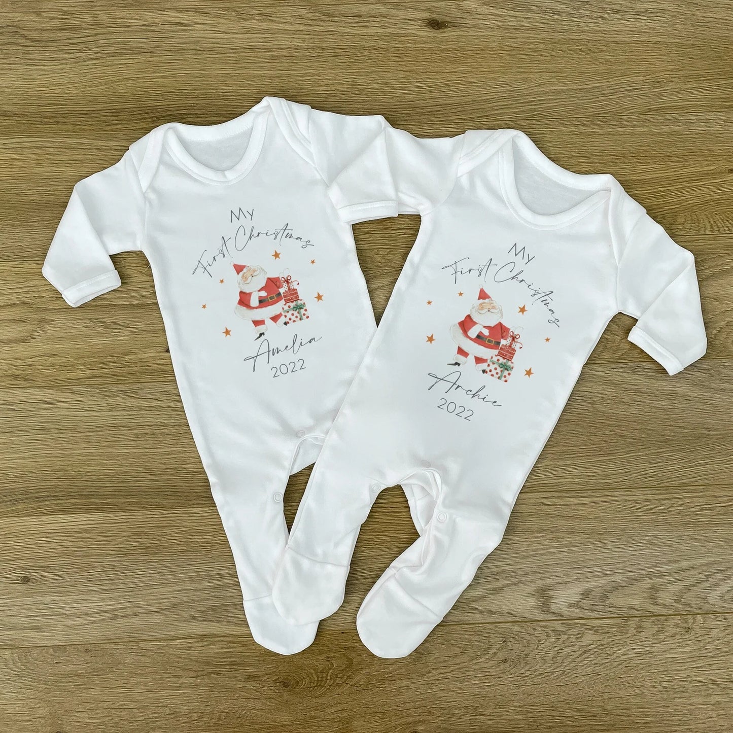 This beautiful personalised first Christmas baby vest & sleep suit makes the perfect outfit for a First Christmas. It can be personalised with any name & year to make it extra special. It works great as Christmas Eve pyjamas too! Suitable for both a baby boy and a baby girl, this makes a great First Xmas Gift