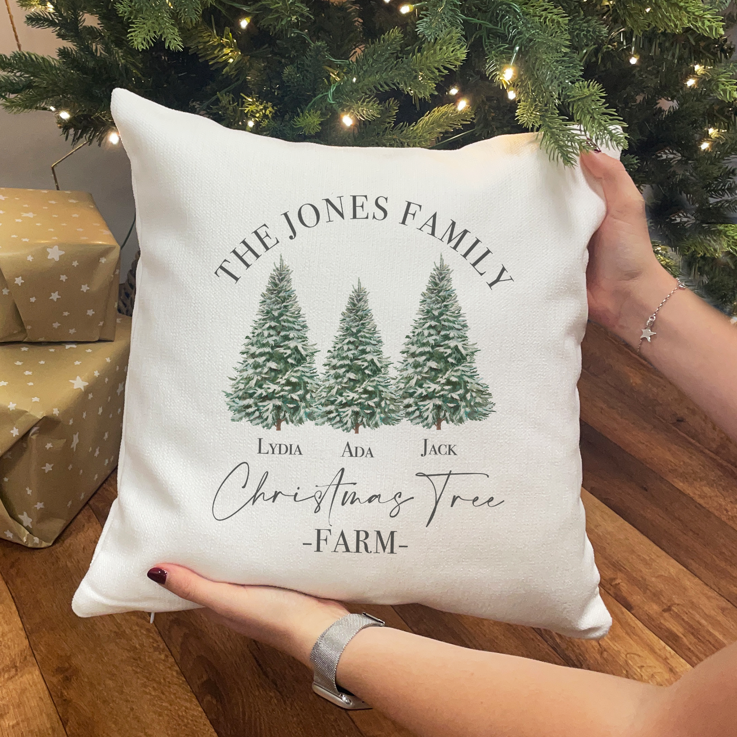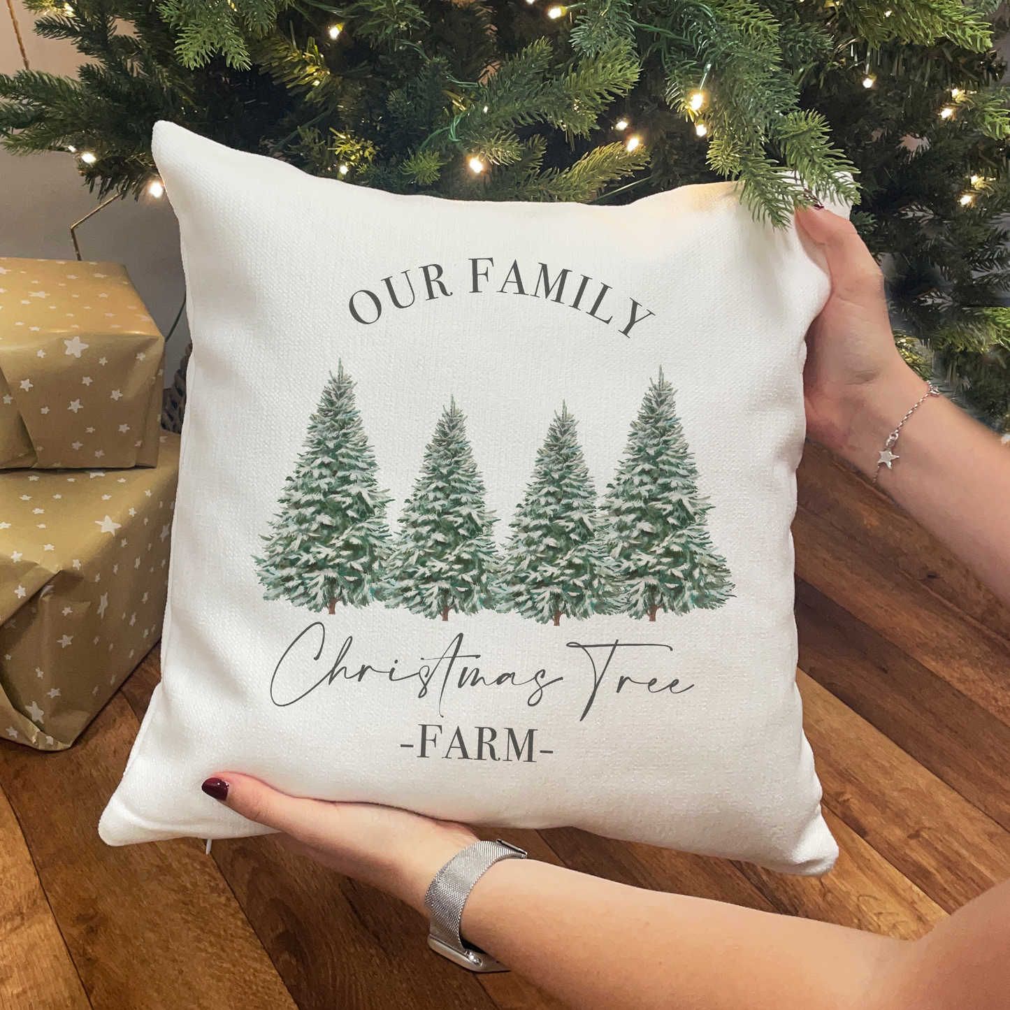 Cushion reads: The *NAME* Family / Our Family Christmas Tree Farm