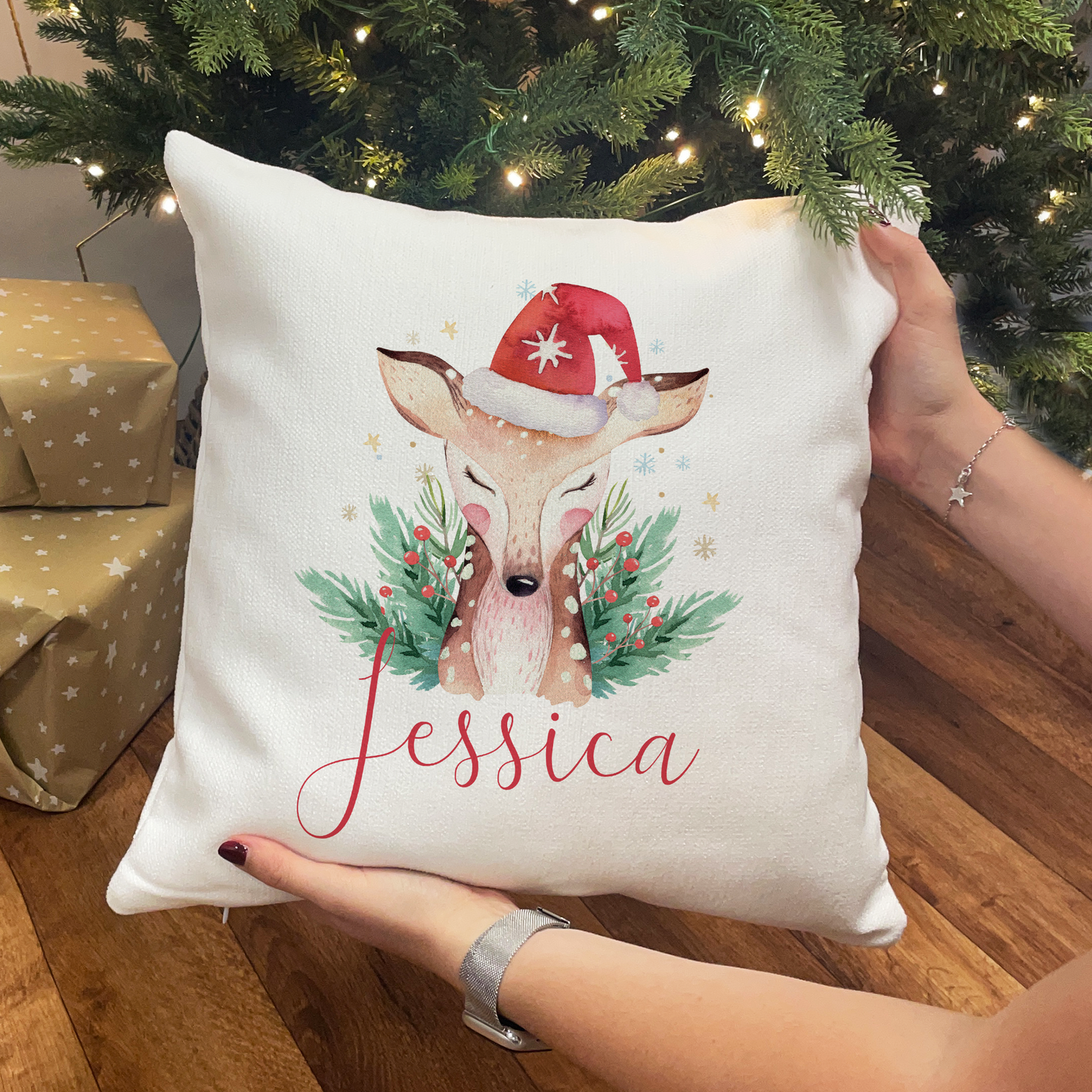 This beautiful personalised cushion is a perfect addition to any house this Christmas. It can be personalised with any family name or name. The design features a stunning watercolour reindeer.