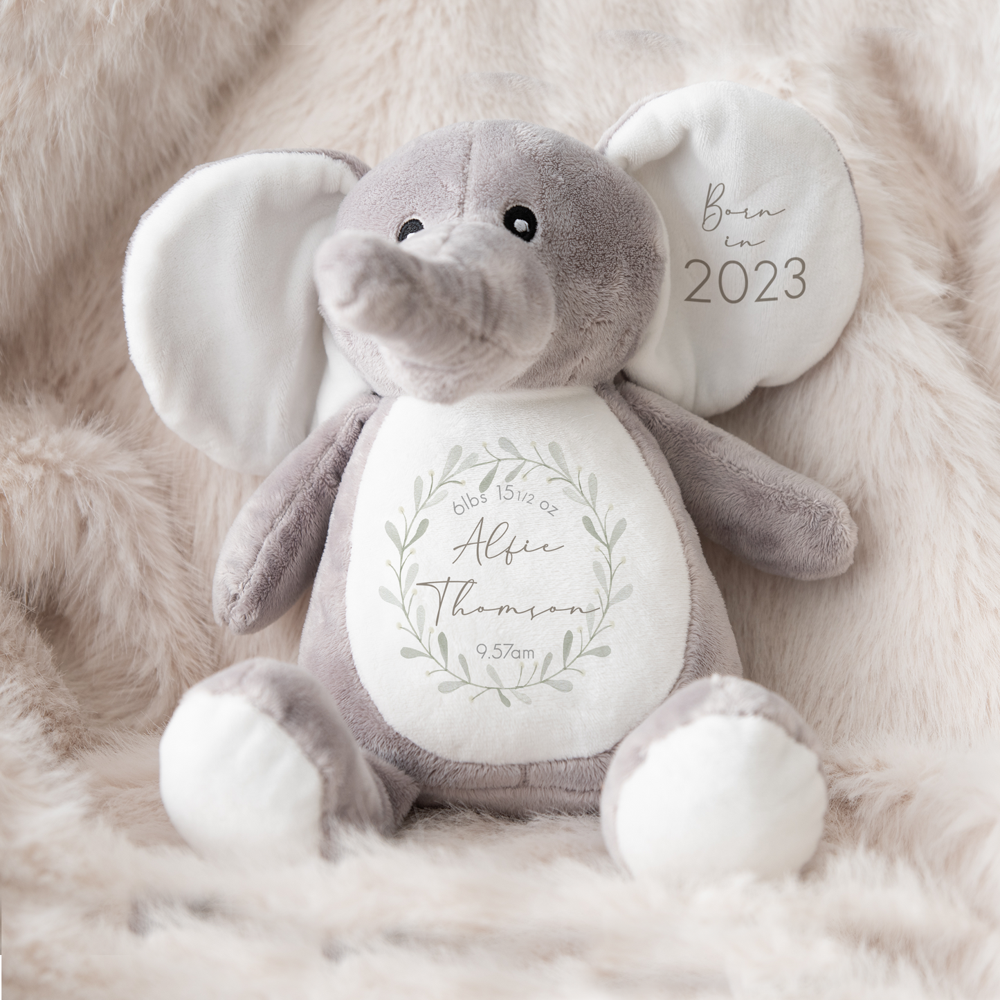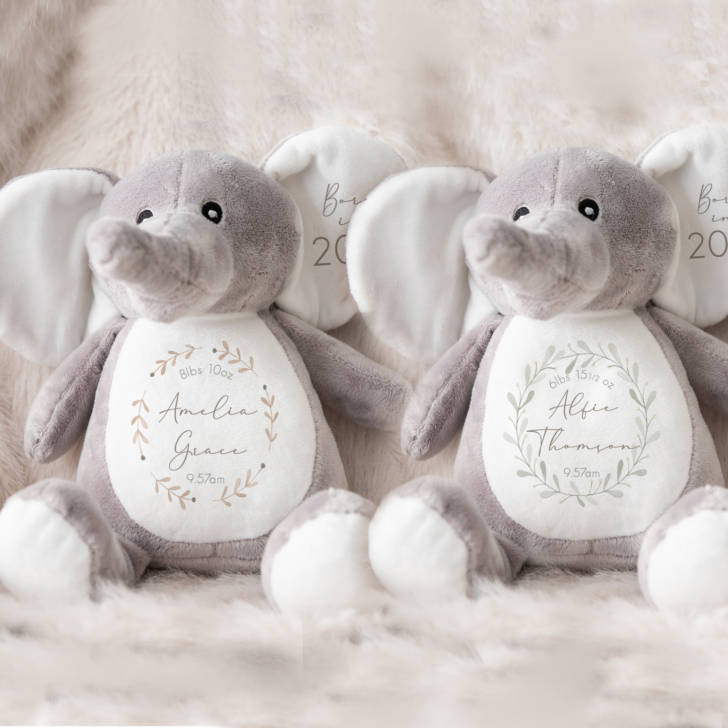 These stunning personalised elephant plush toys are the perfect gift for new baby boy or baby girl. They can be personalised with any name, year, and you can choose to have the babies weight and time included too! This is such a special keepsake gift. The ear of the elephant is printed with the year that baby was born