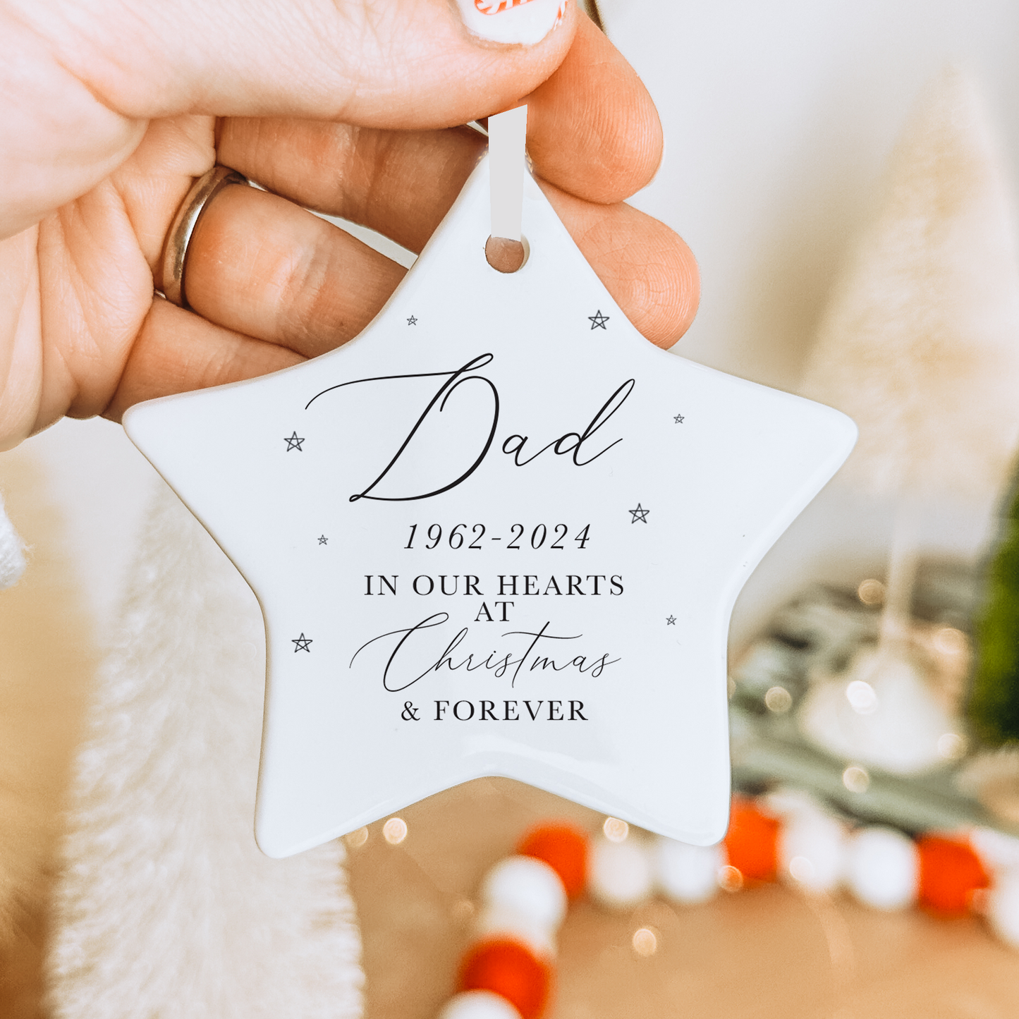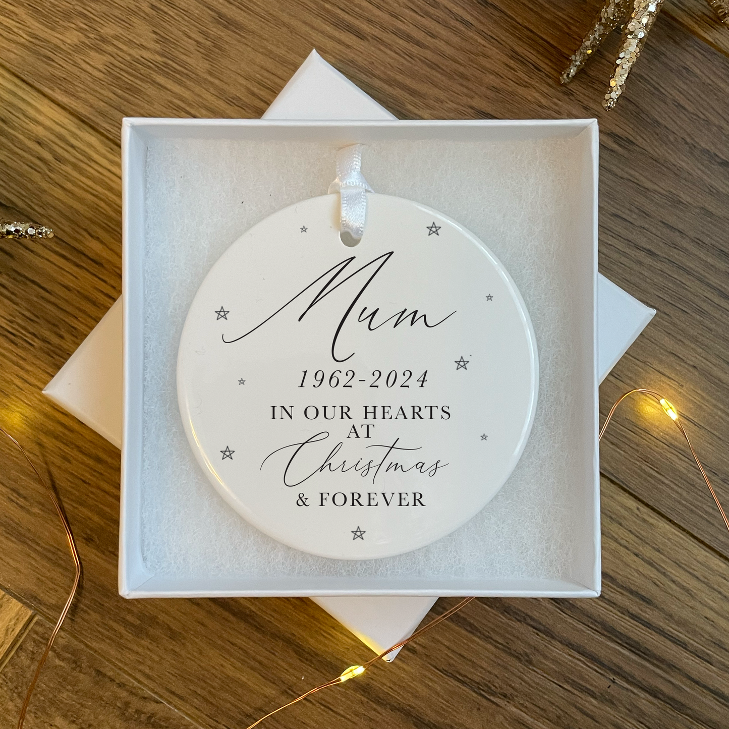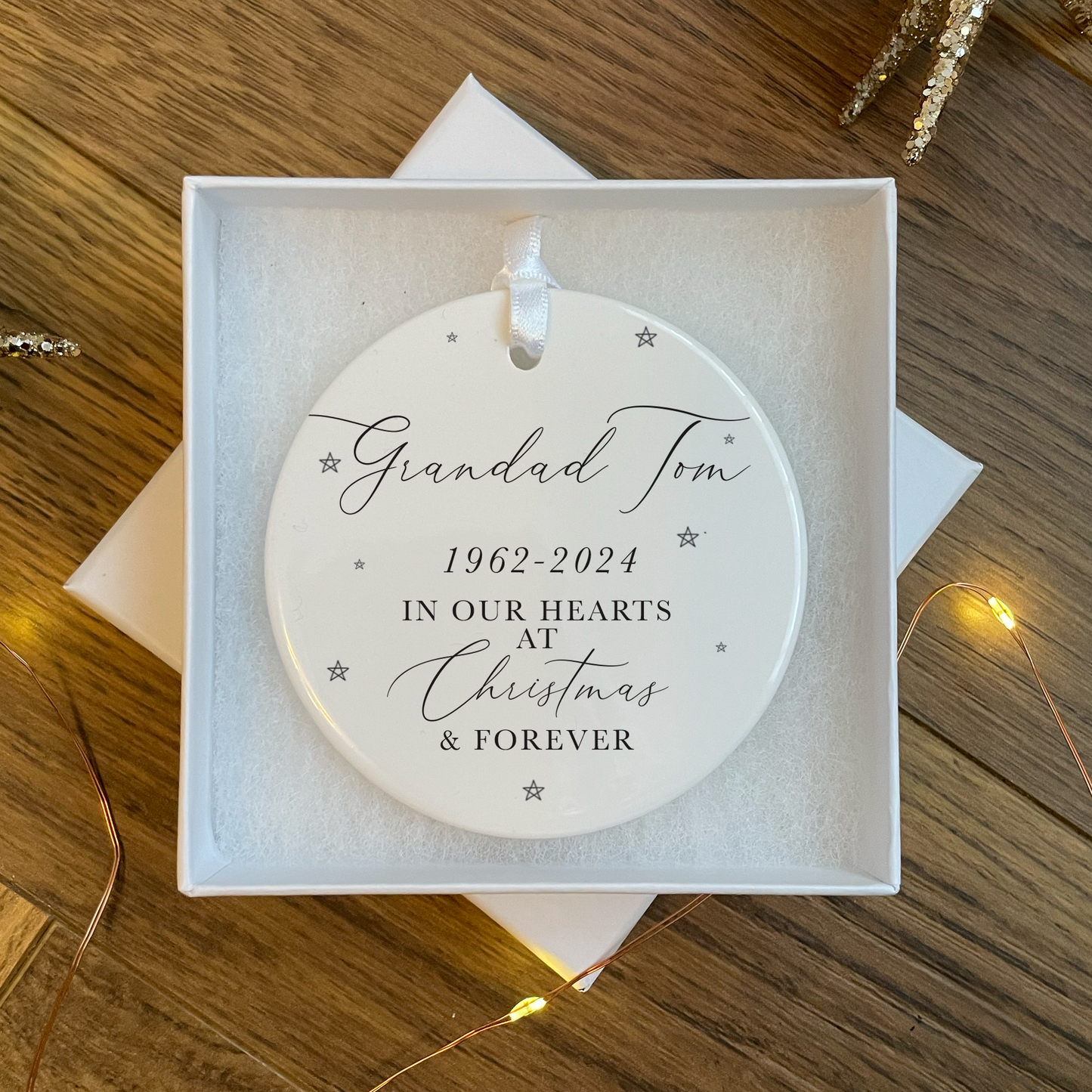 This stunning personalised Christmas memorial bauble is the perfect way to remember your lost loved ones this Christmas. It can be personalised with a name & date and displays little stars surrounding the text